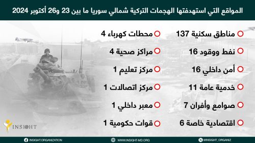 شنت تركيا هجمات عسكرية على مناطق شمالي سوريا ما بين 23 و26 تشرين الأول/ أكتوبر 2024، دون الالتزام بالتمييز بين الأهداف العسكرية والأعيان المدنية، ودمّرت بالضربات العنيفة جزئياً أو كلياً البنى التحتية والخدمات الأساسية في المنطقة.