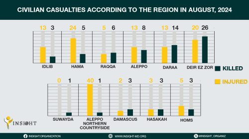 In August of 2024, Deir ez zor was one of the areas with highest number of civilian casualties, followed by Daraa then Aleppo, as there were new attacks, and the spread of many armed groups that belong to the conflicting parties in the same area.